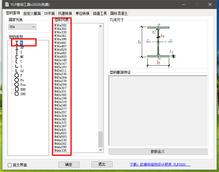 本软件主要有6大功能:国际型钢查询、自定义截面参数查询、2D平面混凝土截面查询、单位换算、插值工具、AutoCAD绘图插件。
