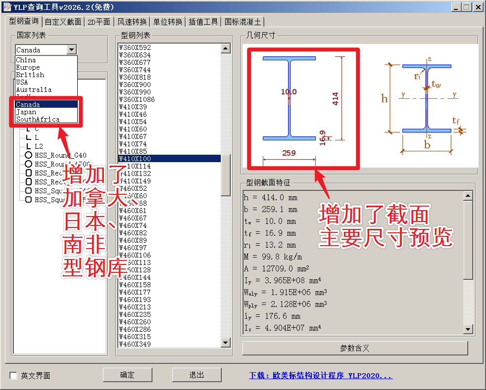 2026.4.13 更新内容:新增了加拿大、日本、南非的型钢库,增加了截面主要尺寸预览。
