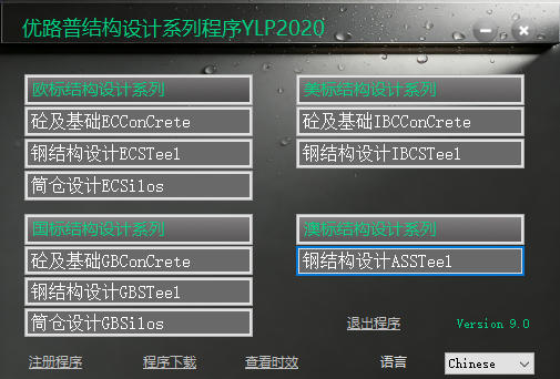 The current version of the YLP2020 program package is v9.0. The program package consists of four structural design modules, namely the European standard module, the American standard module, the Australian standard module, and the Chinese standard module. Among them, the European standard module includes: the concrete and foundation design module ECConCrete, the steel structure design module ECSTeel, and the silo design module ECSilos; the American standard module includes: the concrete and foundation design module IBCConCrete, and the steel structure design module IBCSTeel; the Australian standard module includes: the steel structure design module ASSTeel; and the Chinese standard module includes: the concrete and foundation design module GBConCrete, the steel structure design module GBSTeel, and the silo design module GBSilos.